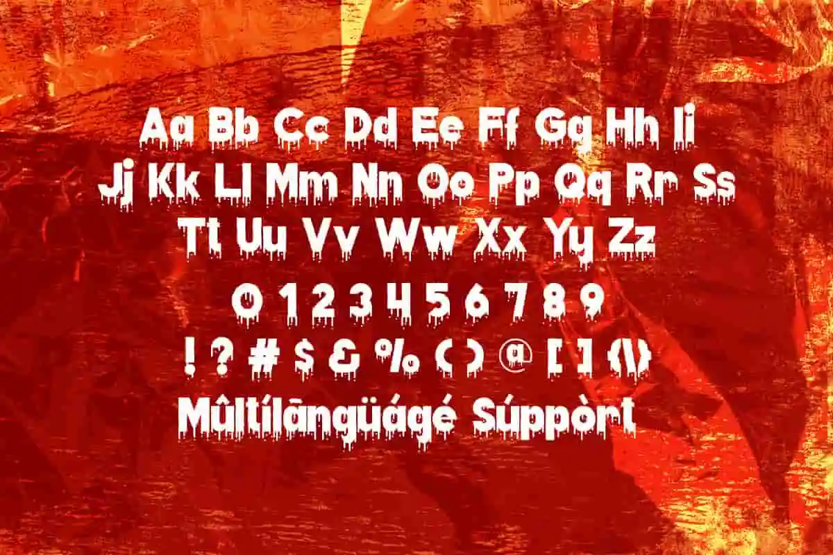 This font includes a full set of uppercase and lowercase characters, numbers and symbols all using ink drop horror. Watch how this font brings your work to life, supports multilingual. Works on PC & Mac. Immediate action on posters, print material, walls, web pages and more.