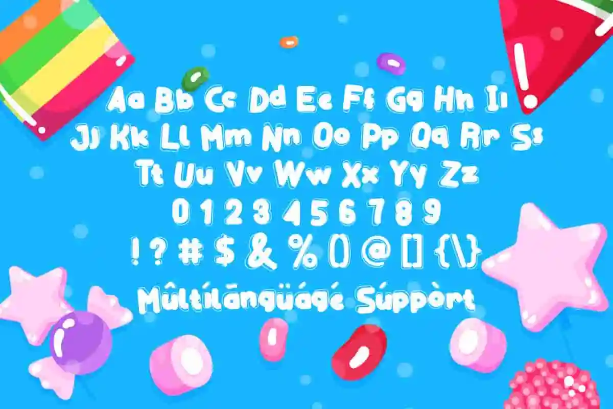 Gummy Candy Display Font is cute and unique character features a full set of lowercase and uppercase letters, numbers, symbols so you can stand out and use them for book covers, toy cards, webpages and more!!!