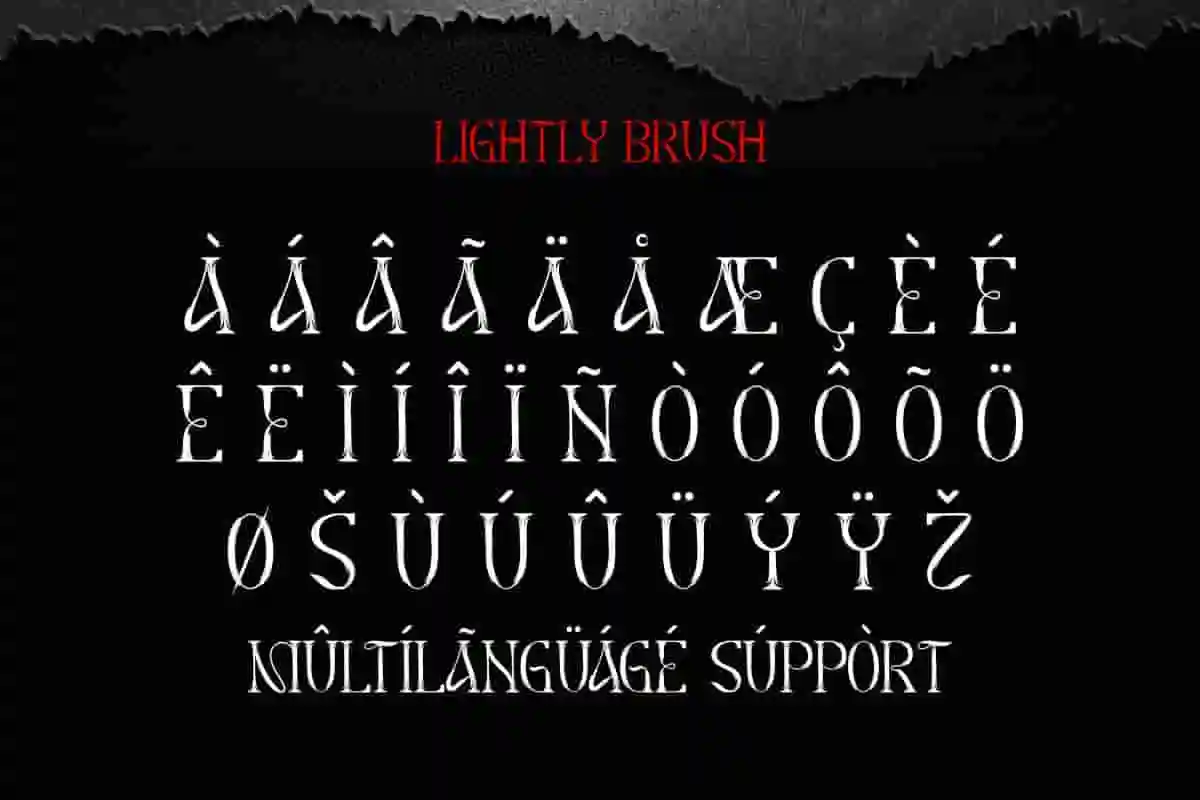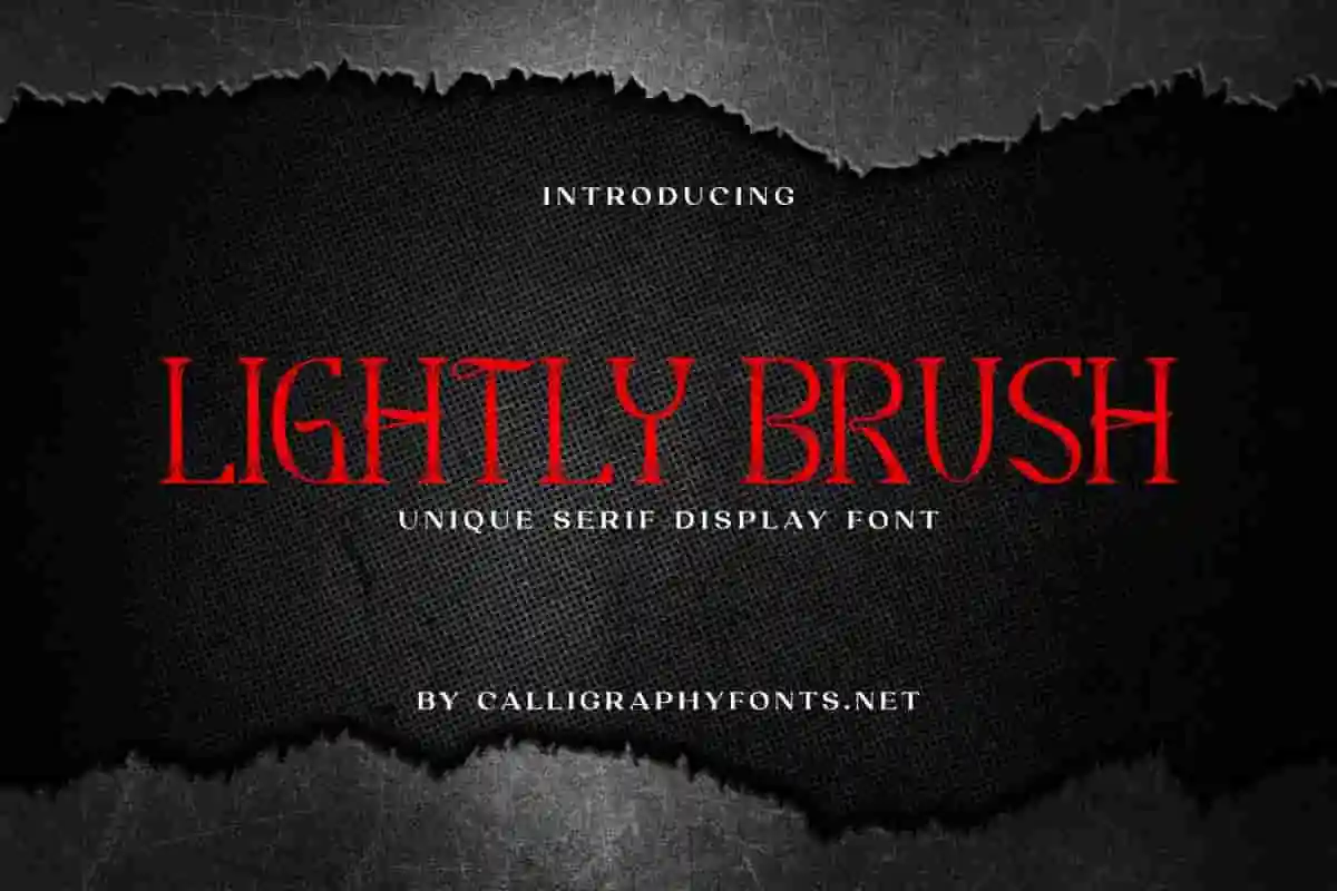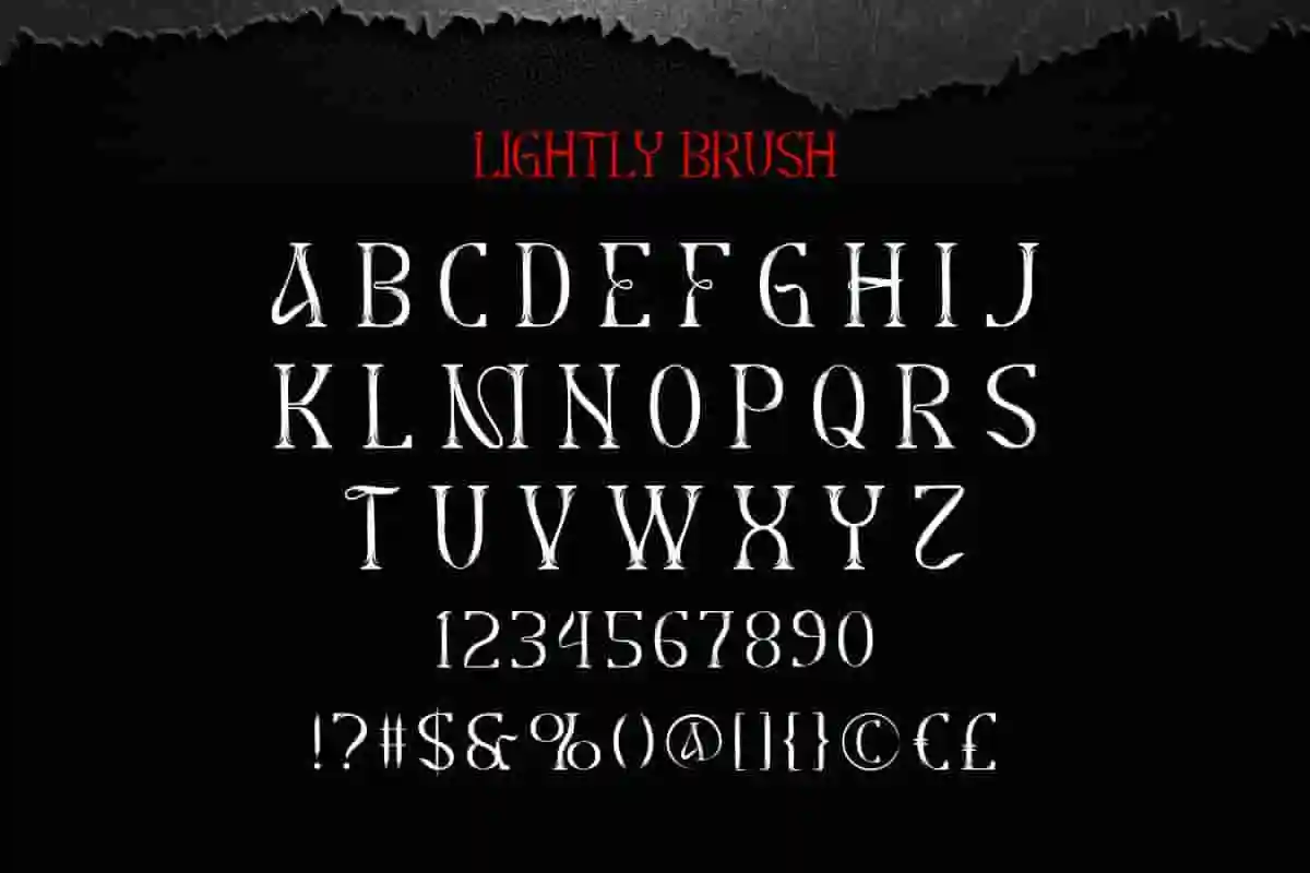 Lightly Brush Font is a uniquely mysterious serif display font created by CalligraphyFonts.net. This font bring a spooky vibe to your design that will be perfect for any creative project, including: billboard, header, label, poster, signage, stationery, t-shirt design, vinyl cover, and anything that requires a stylish and slightly gruesome look.
