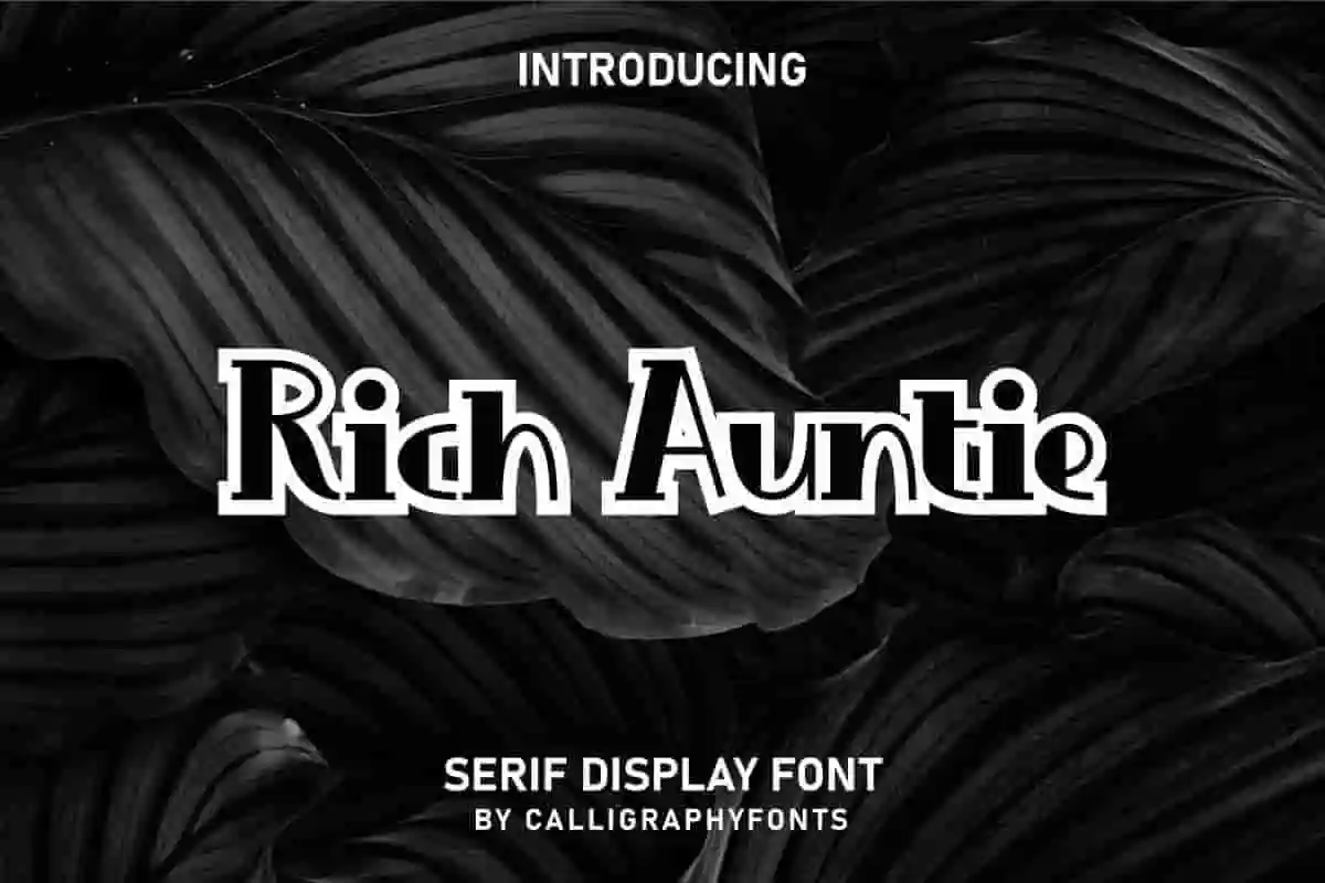 Rich Auntie Font is a fun modern serif display font with a unique playful style. It will look stunning on café, company sign, fashion magazine, headline, invitation, logo, movie, packaging design, print material, shirt, tote bag printing, lettering, and various other modern creations.